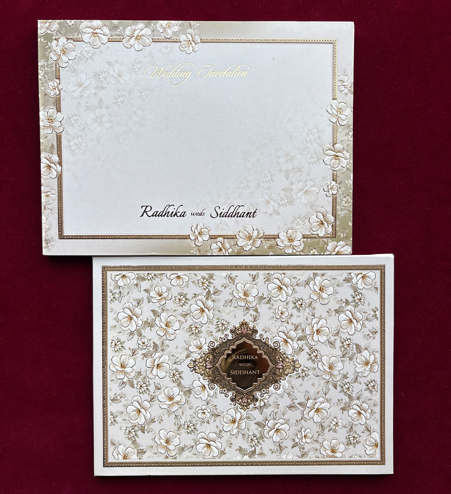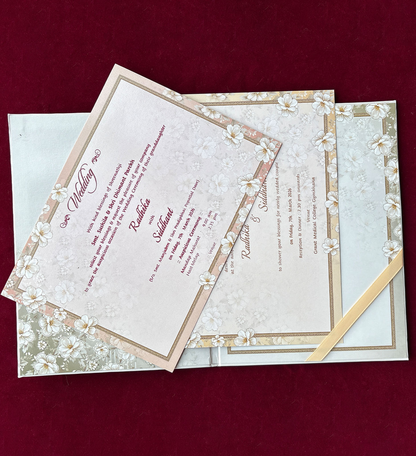 Hard bound wedding card with soft floral border detailing and elegant minimal center layout.