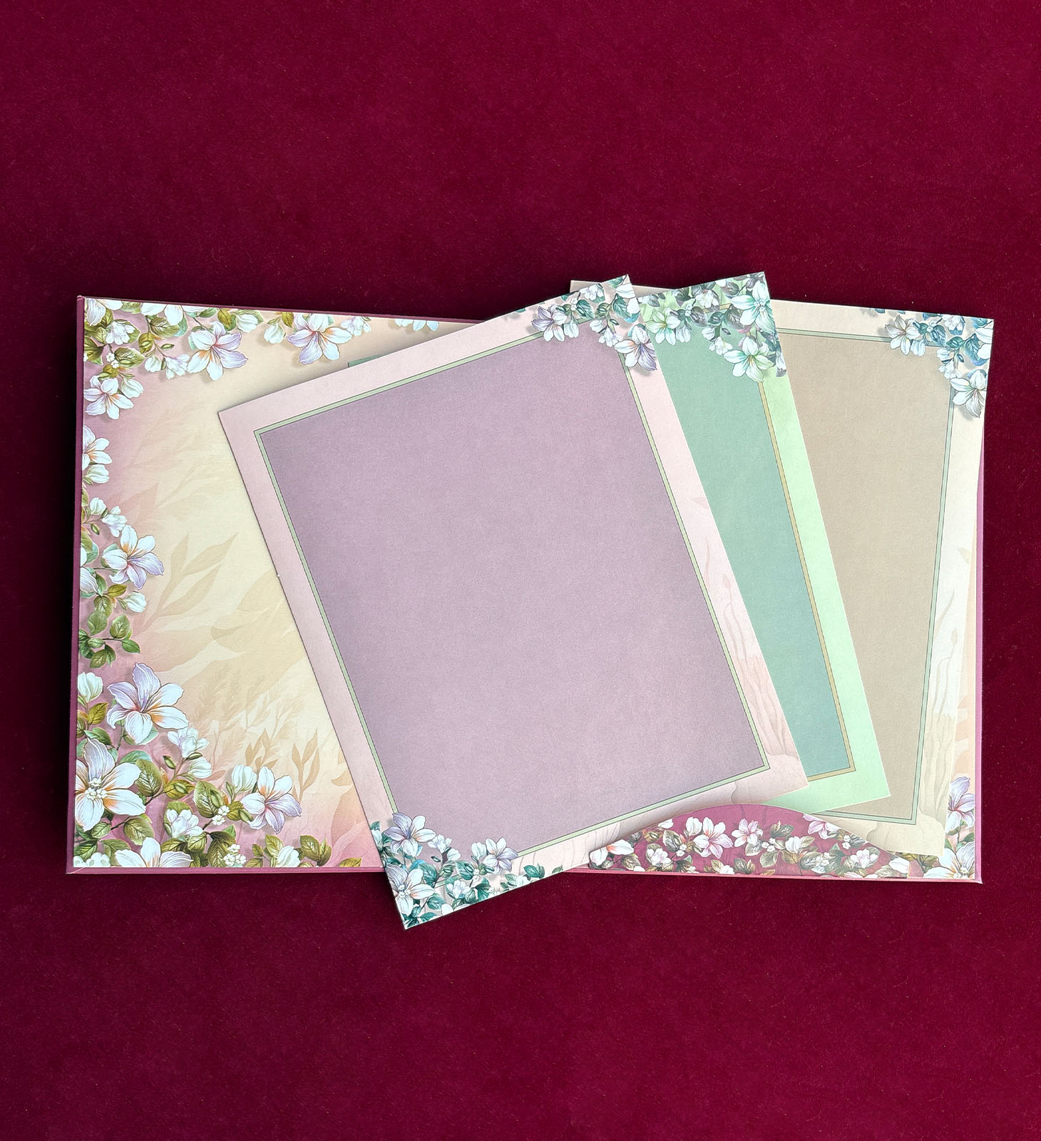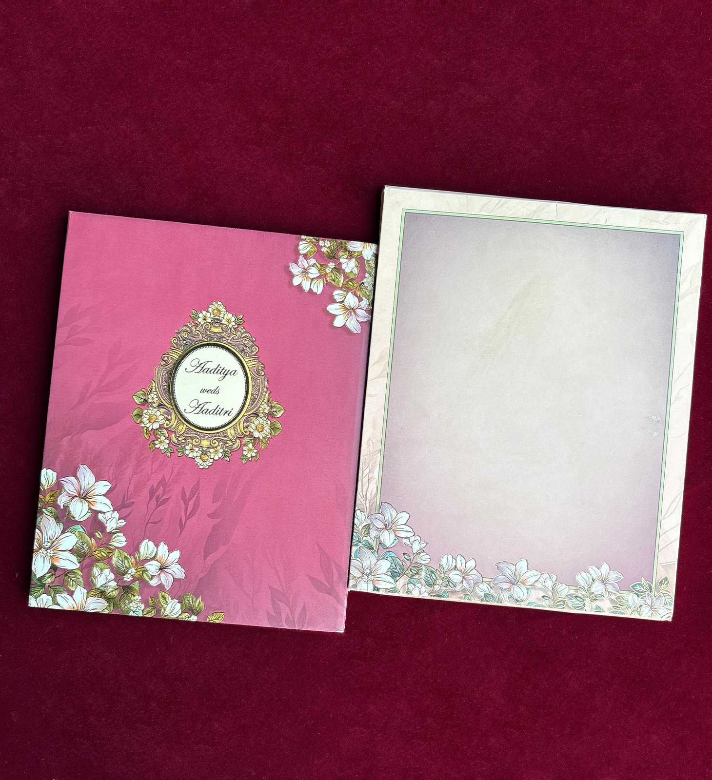 Rich pink invitation with floral medallion centerpiece, gold accents, and soft botanical detailing.