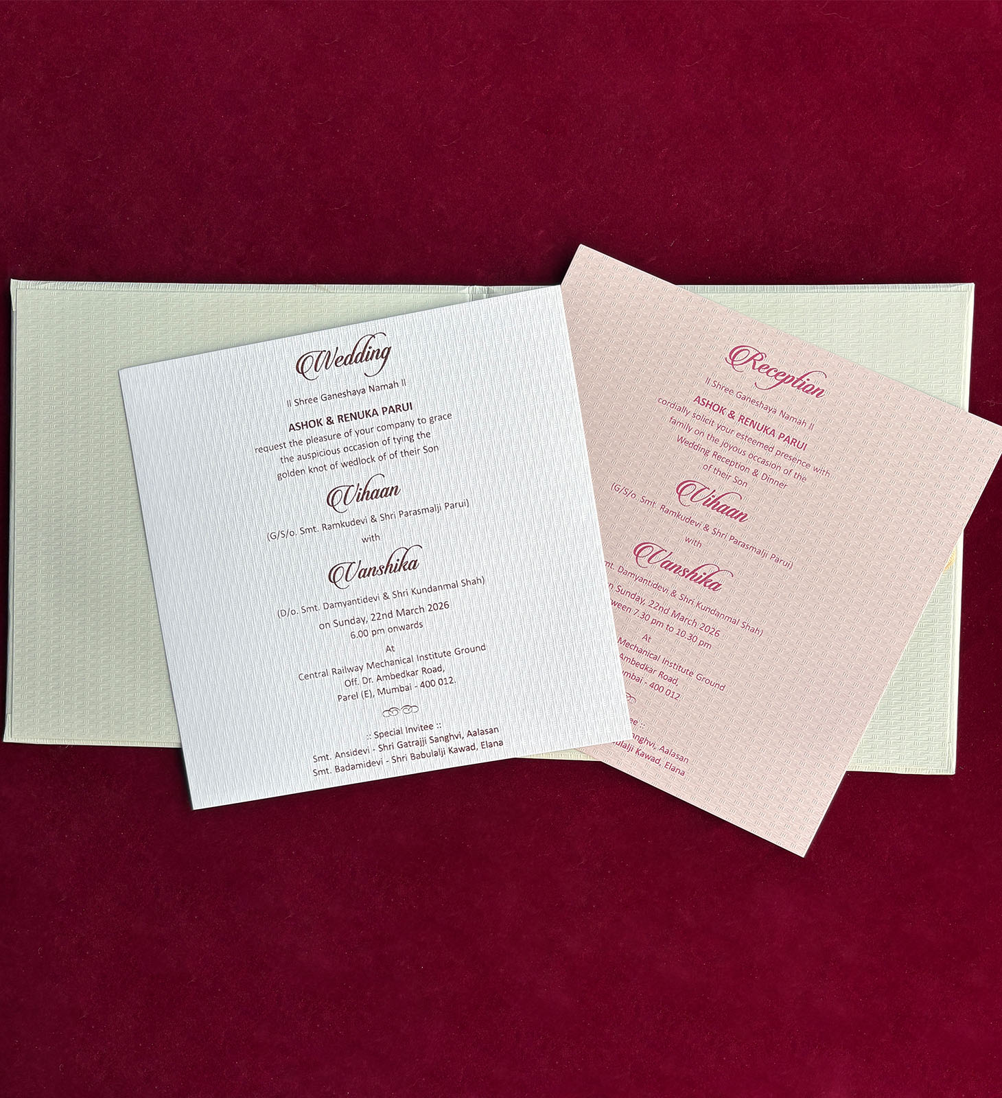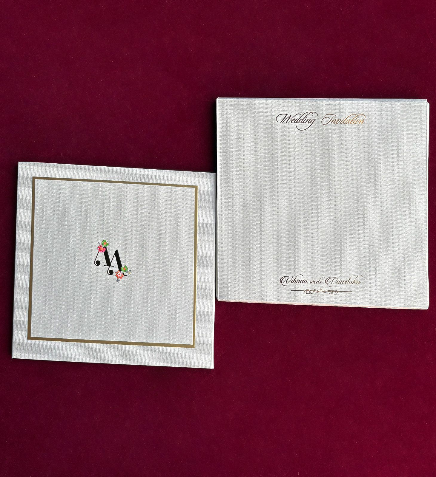 Minimal ivory invitation with subtle texture, gold border frame, and floral-accented monogram. Clean and elegant design.