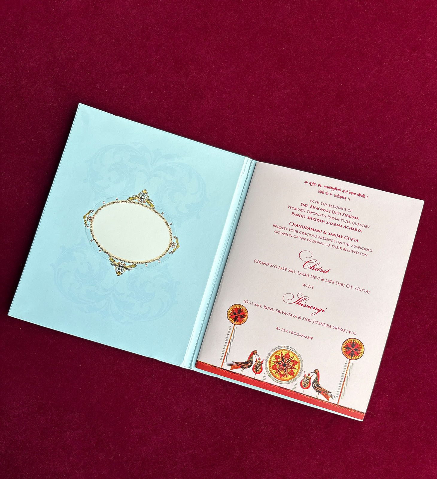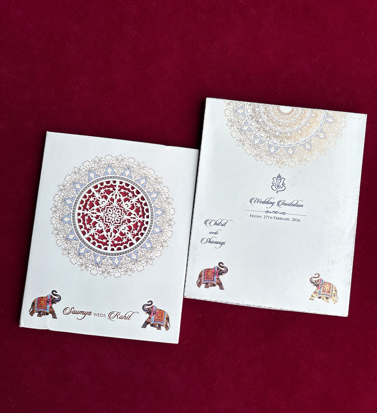 Royal laser cut wedding invitation with intricate mandala cutwork and elephant motifs.