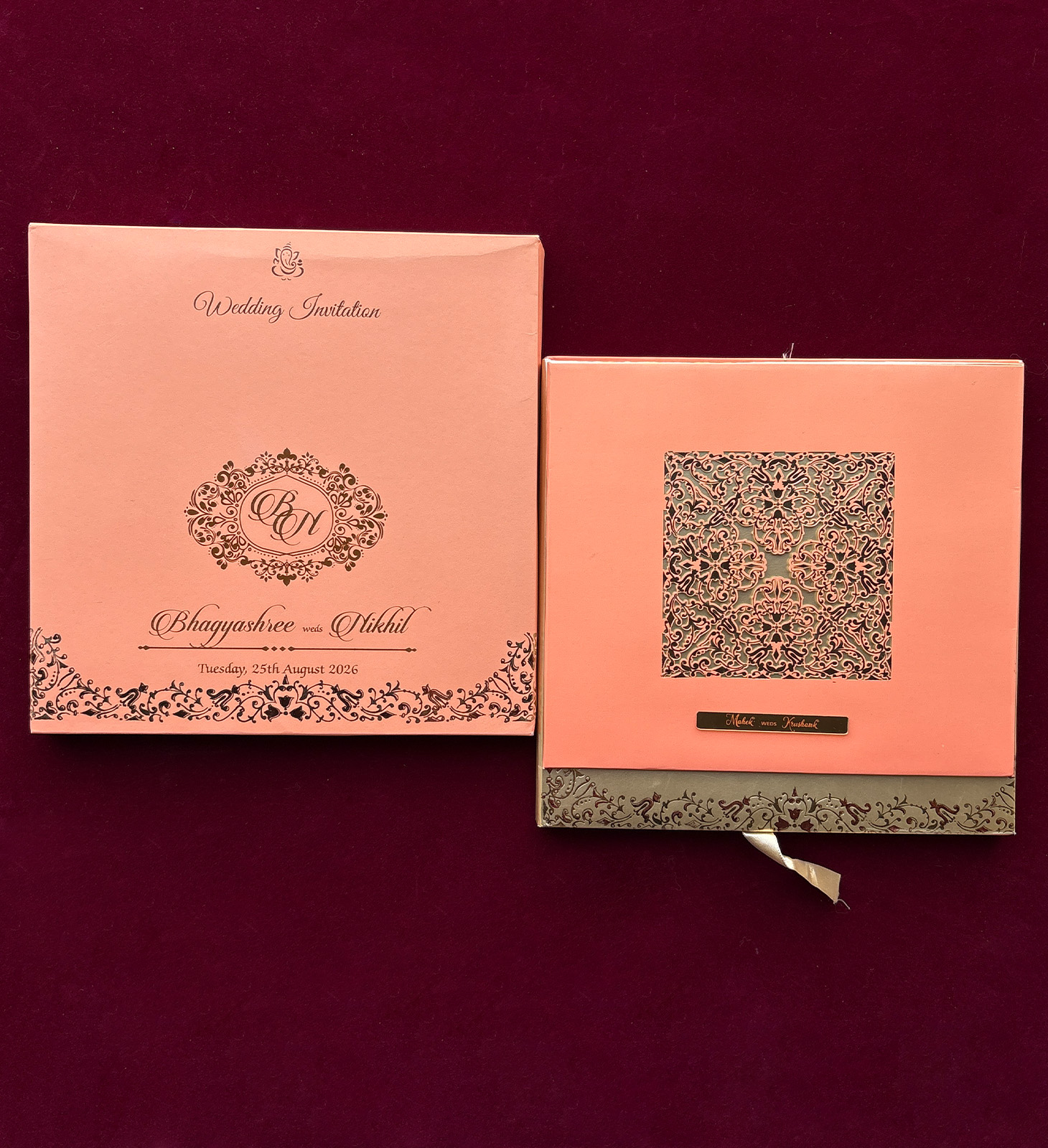 Soft peach laser-cut monogram invitation with premium finish