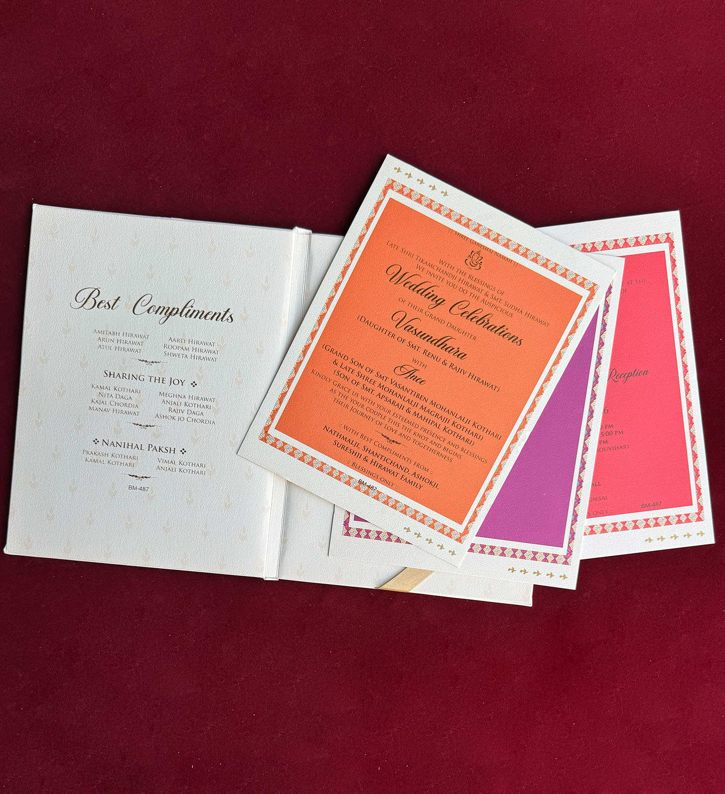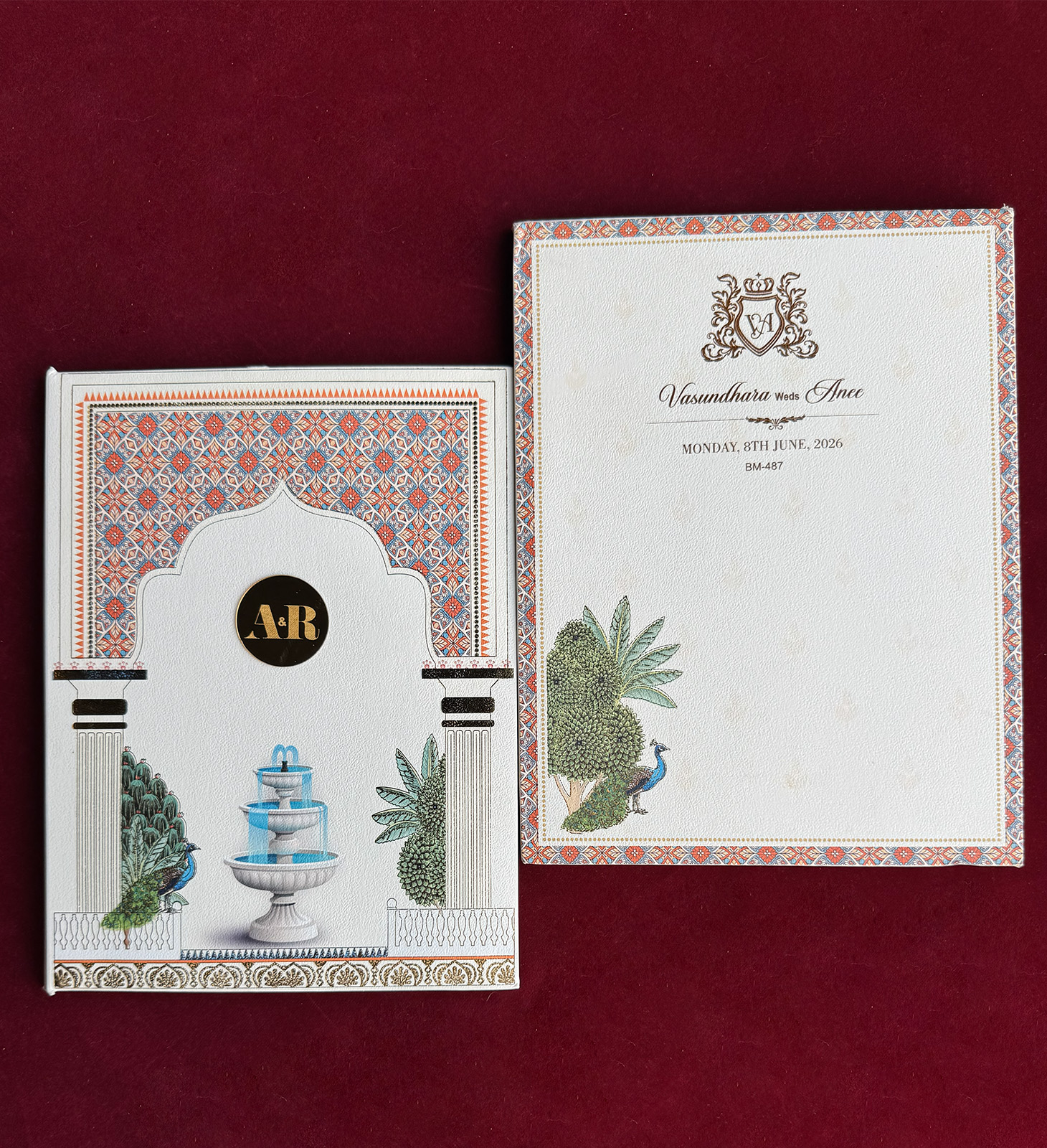 Peacock themed semi box wedding invitation with rich ethnic patterns and artwork.