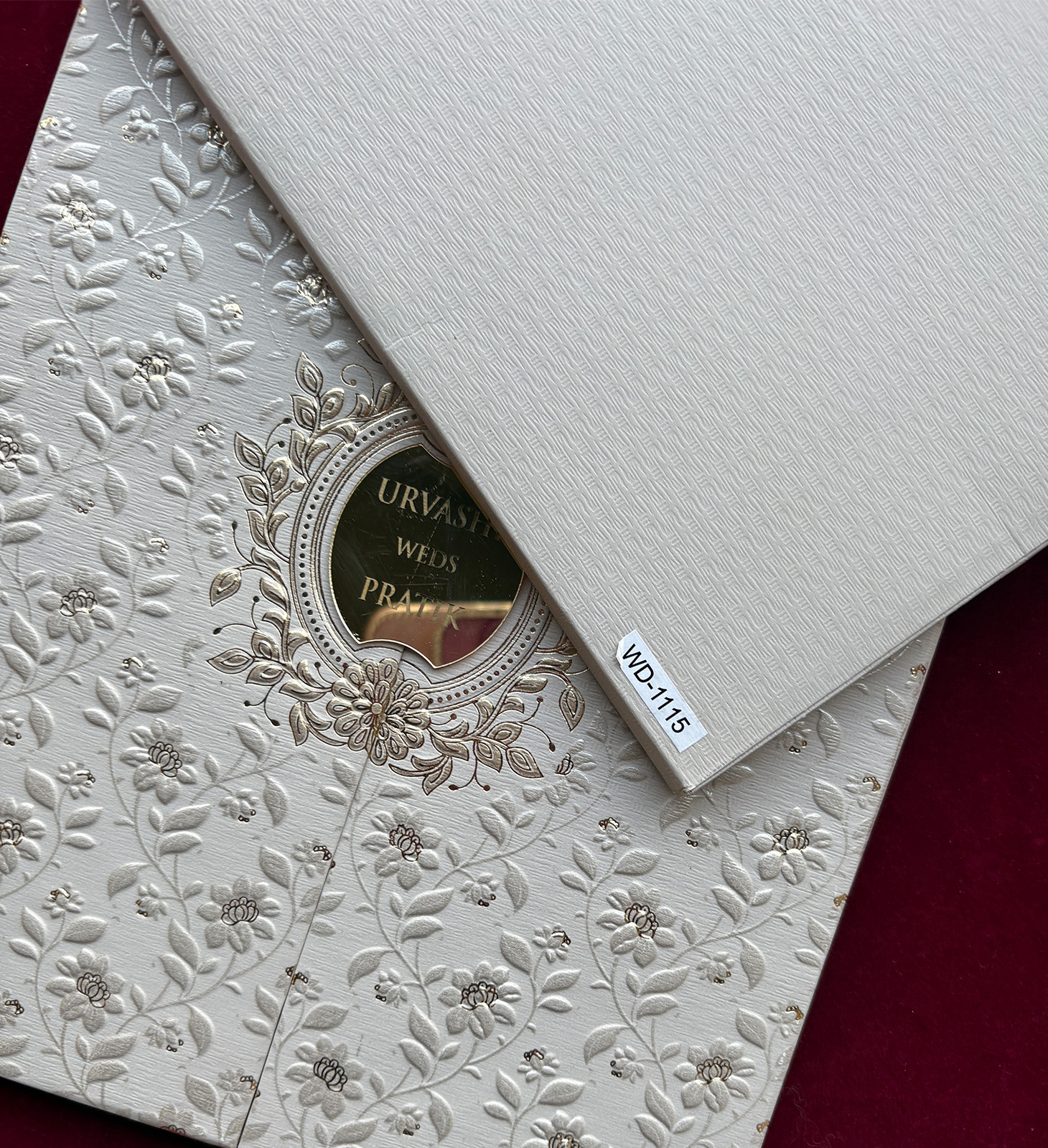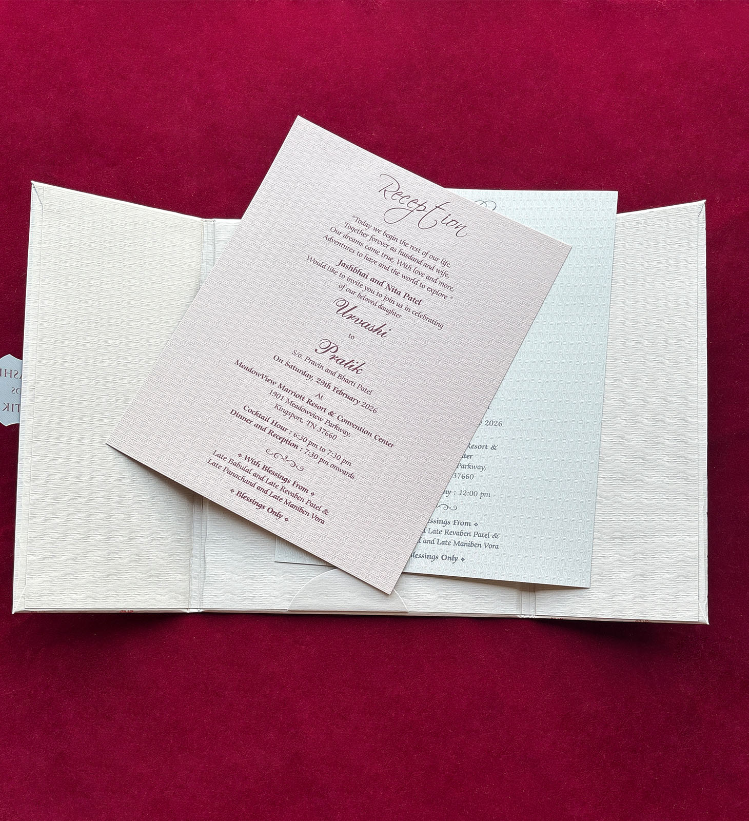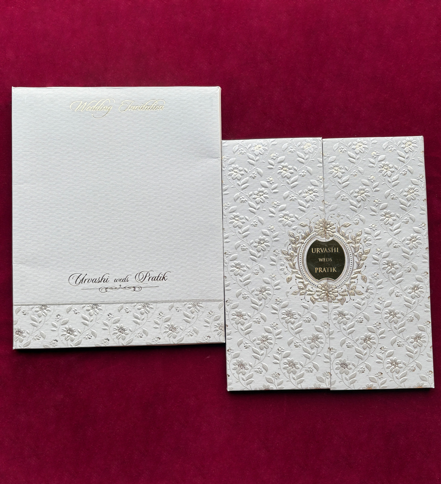 Hard bound wedding invitation with bold purple floral arch design and contrasting inner card.