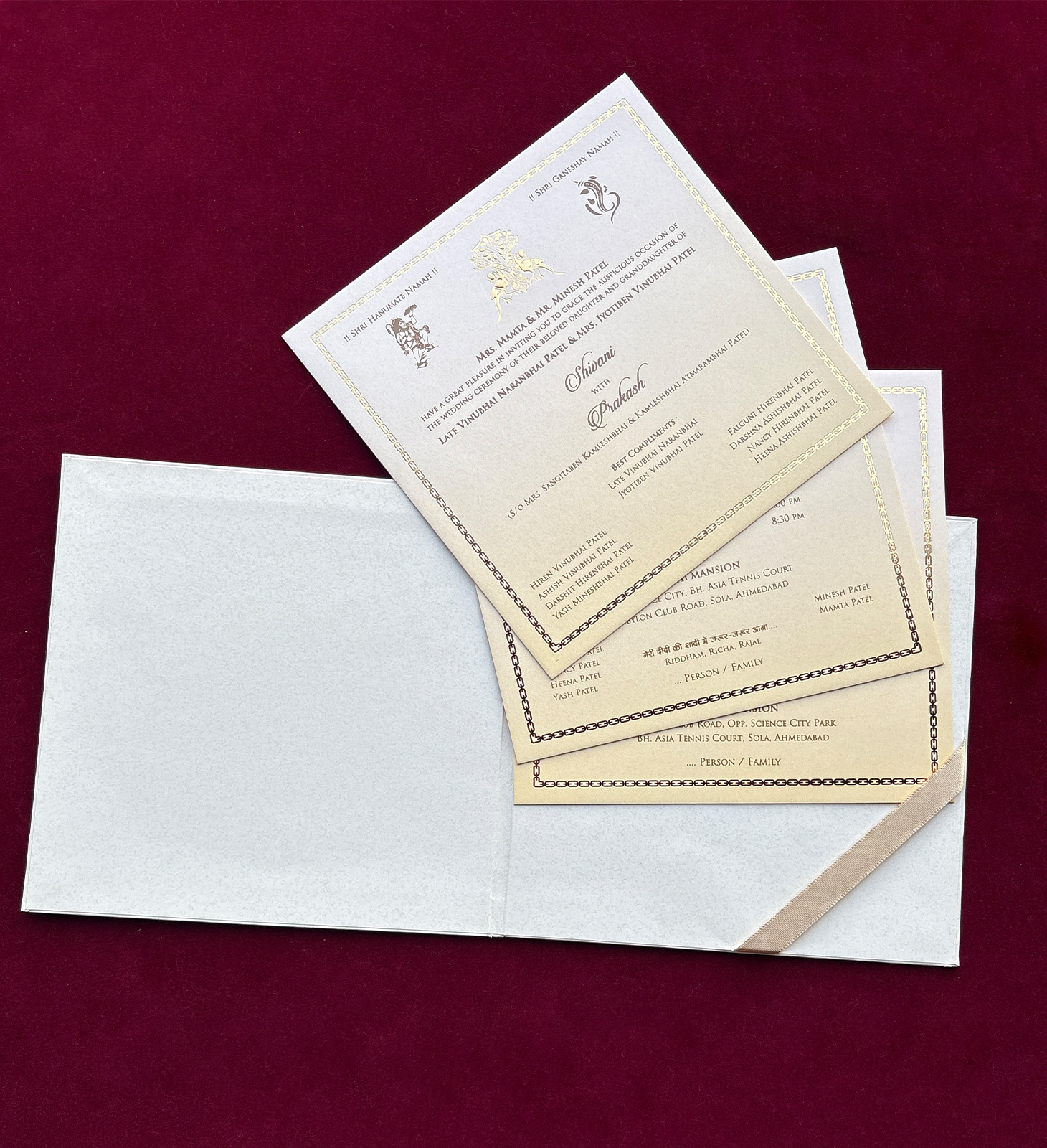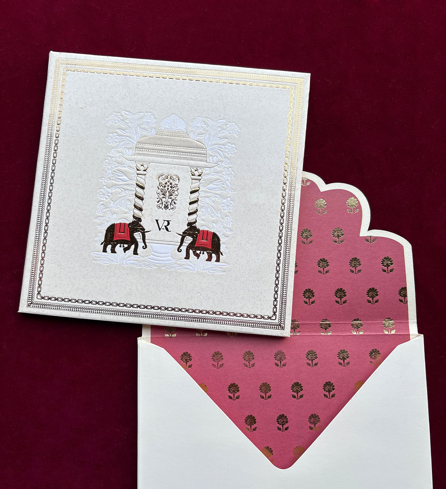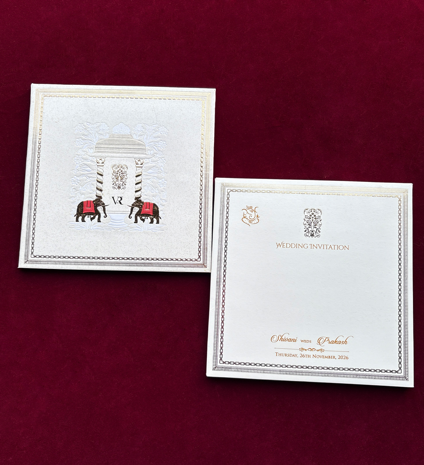 Square box invitation with ornate elephant motifs, pillar illustration, gold foiling, and heritage-inspired artwork. Designed for grand traditional weddings.