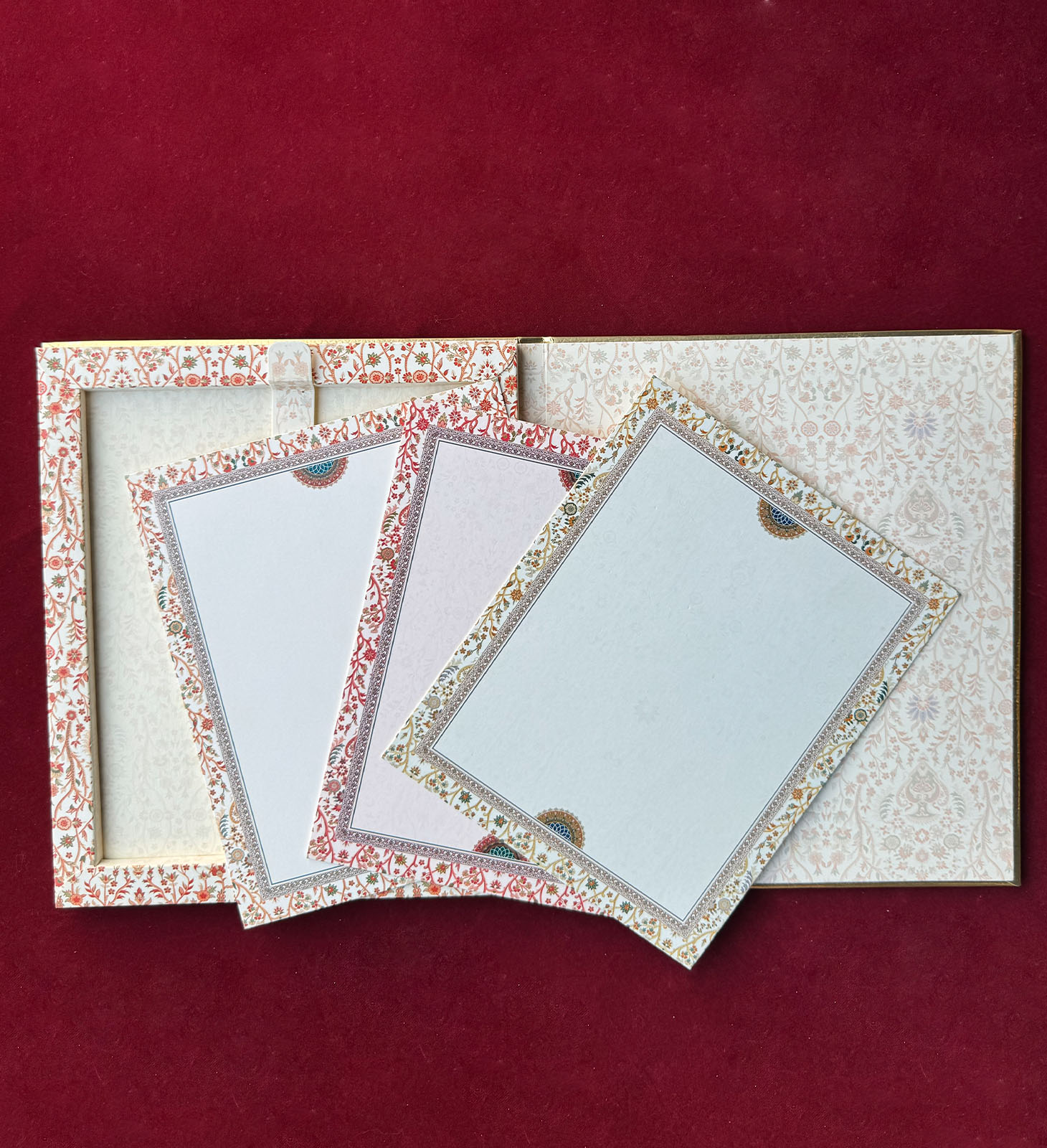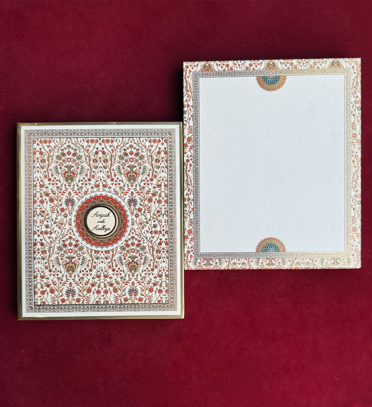 Traditional floral patterned hard bound wedding invitation with premium print and classic layout.