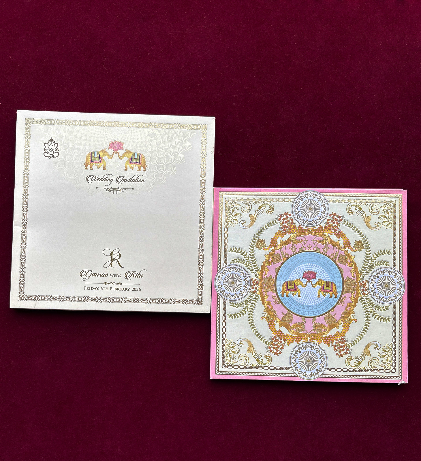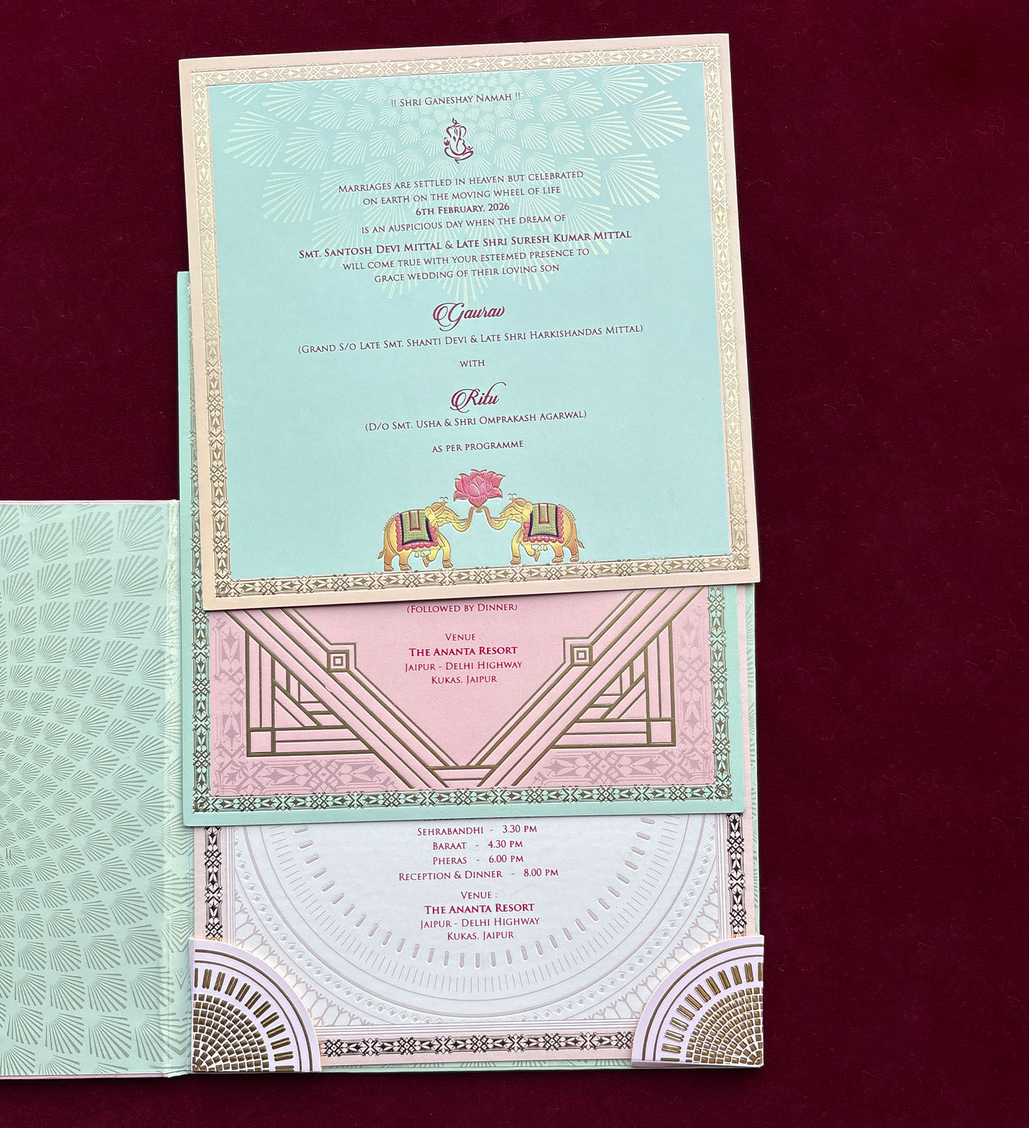 Artistic invitation showcasing a stylized Tree of Life with peacock detailing and metallic accents, symbolizing prosperity and unity.